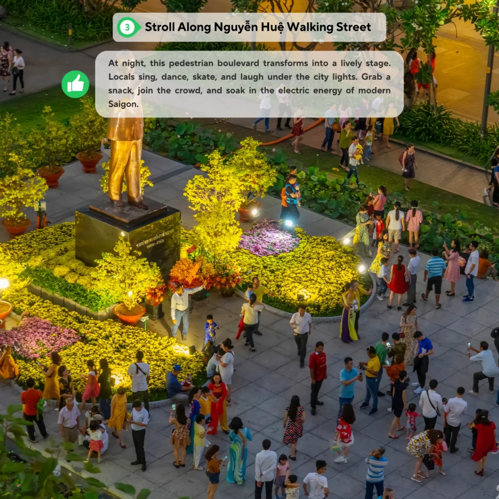 At night, this pedestrian boulevard transforms into a lively stage. Locals sing, dance, skate, and laugh under the city lights. Grab a snack, join the crowd, and soak in the electric energy of modern Saigon.